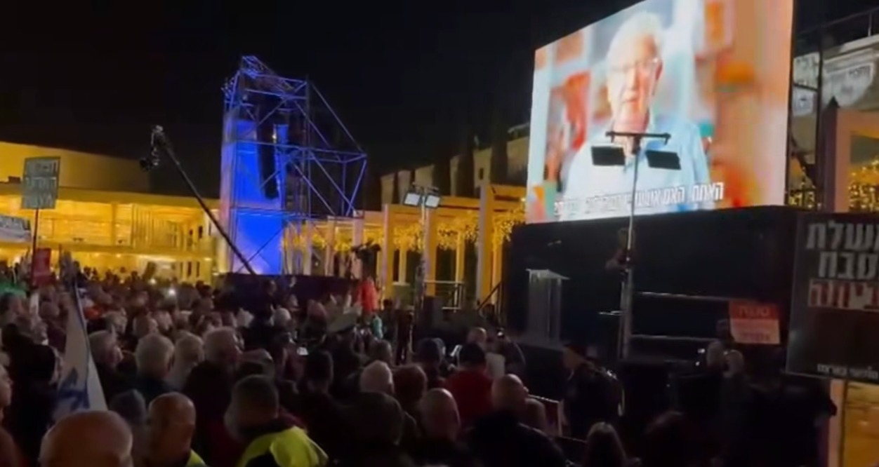 Aharon Barak, l’ancien président de la Cour suprême, s’adressant aux manifestants le 3 janvier à Tel Aviv La récente interdiction d’entrée en Israël de