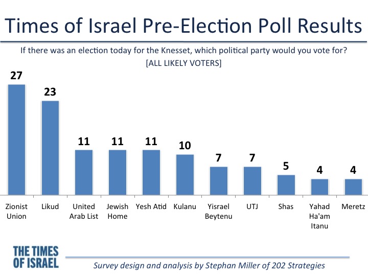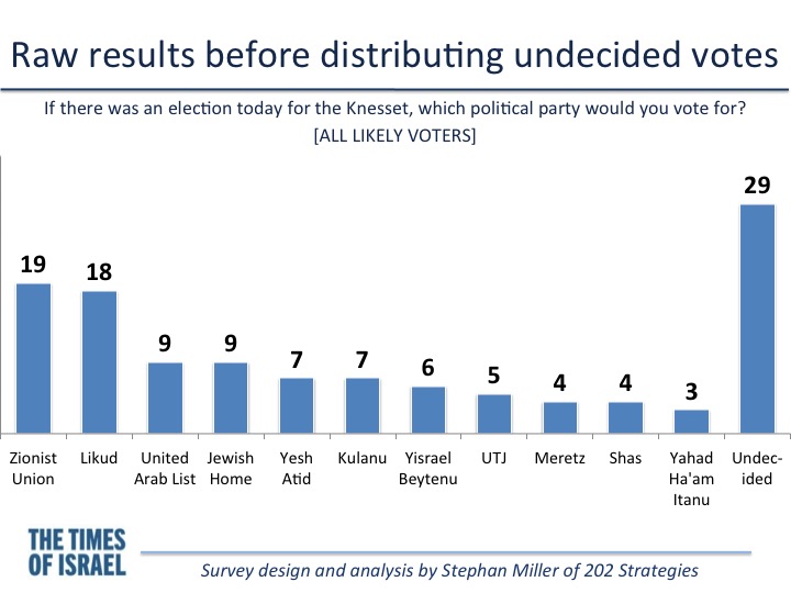 [Dans le nouveau sondage réalisé pour le The Times of Israel], les données suggèrent que plusieurs de ces électeurs indécis sont, cependant, déçus de Netanyahou, faisant ainsi baisser sa cote de popularité personnelle et professionnelle. Ces 24 % penchent davantage vers Herzog du Camp sioniste.